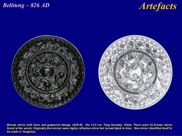 Belitung mirror however there is little evidence to suggest that it is a Tang imitation of an old Han mirror Although some of the thin scrolls appear somewhat unusual in their sinuous flow the mirror s design is essentially consistent with that of mirrors dating from the first century BC and the first